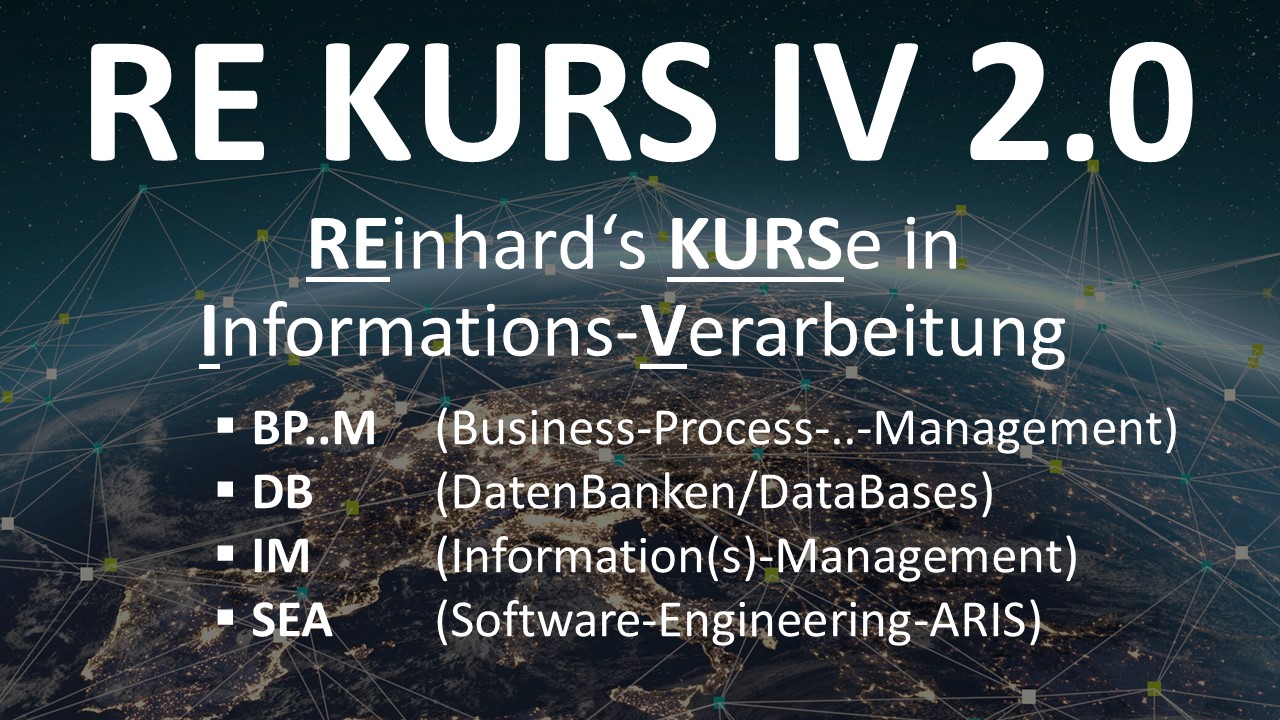 Dieser Kurs enthält meine/Reinhard Elsner's Kurse im Haupt-/Master-Studium. RE KURS IV steht dabei für meine Kurse in Informations-Verarbeitung/Wirtschaftsinformatik, also mehrere Veranstaltungen: