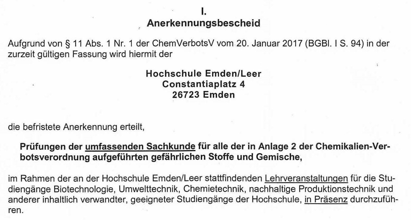 Unsere Hochschule hat als eine von ganz wenigen Hochschulen in Niedersachen die Anerkennung für die Durchführung solcher Kurse und auch die Berechtigung zur Abnahme der amtlichen Prüfung. Vergleichbare Kurse bei kommerziellen privaten Anbietern wie TÜV, Dekra u.a. kosten ca. 1500-2000,- € (pro Person!) und dauern in der Regel eine Woche in Vollzeit. Sie können die "Sachkunde" hier in Emden an Ihrer Hochschule kostenlos erwerben!